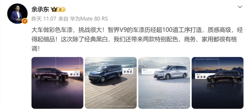 智界V9四款颜色,余承东躬行揭晓,排面拉满;
