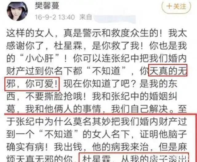 早在2016年,张纪中与前妻樊馨蔓还没离异的时候,杜星霖的名字就出咫尺樊馨蔓的微博里了。