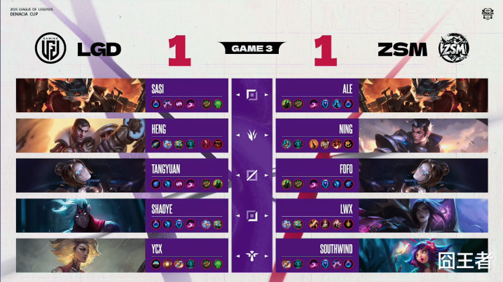 第三局比赛,LGD蓝色方,采取:Sasi兰博、Heng杰斯、Tangyuan发条、Shaoye维鲁斯、YCX芮尔;ZSM红色方,采取:Ale兰博、Ning赵信、FoFo发条、LWX卡莎、Southwind妮蔻